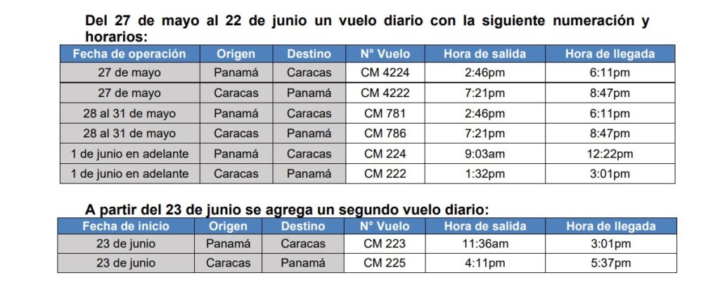 Inicialmente, Copa Airlines volverá a conectar a Venezuela con el resto de Latinoamérica, a través del Hub de Las Américas® ubicado en Ciudad de Panamá con un vuelo diario desde y hacia Caracas desde el 27 de mayo, adicionando un segundo vuelo diario desde el 23 de junio: