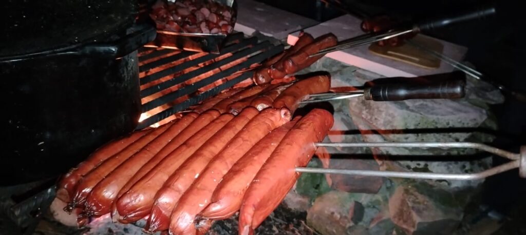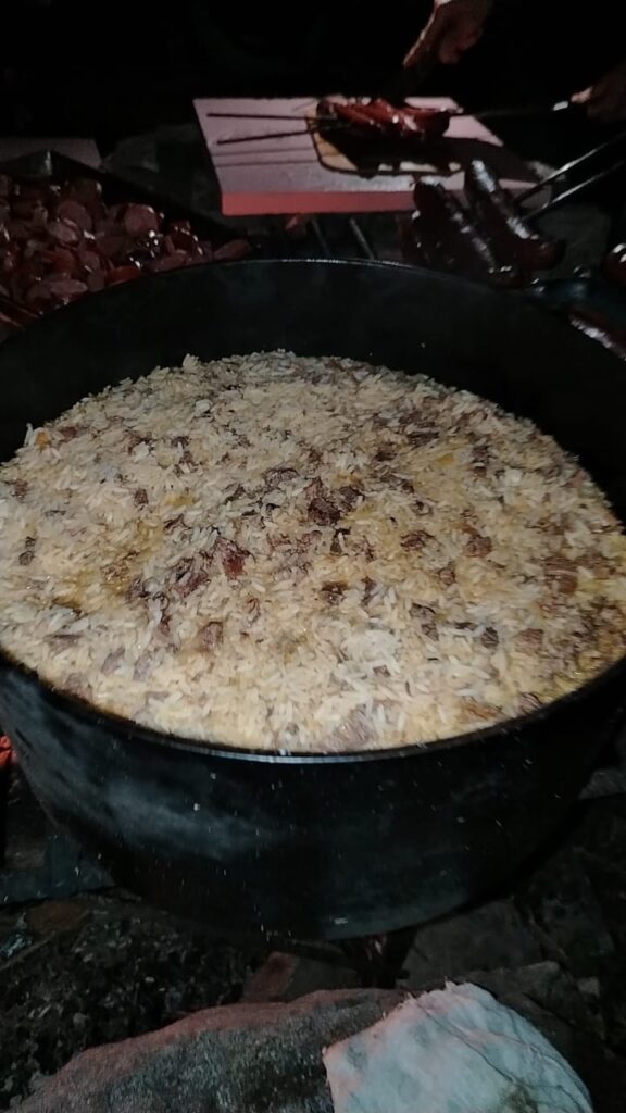 El menú incluye: arroz mateiro (un plato tradicional brasileño), chorizo ​​a la parrilla, queso fundido, café, pan, vino, jugo de uva, agua y postre servido en un recipiente cubierto con paja.